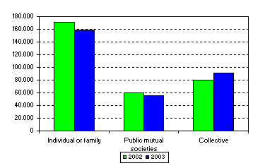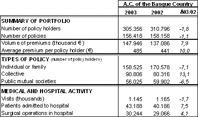 Private Insurance companies as a whole offered a medical team of 7,055 doctors covering all branches of medicine and 451 nursing professionals, treating a total of 1,145,101 outpatient visits (1.7% less with regard to 2002), making an average of 3.7 visits per policy holder. Orthopaedics, paediatrics, gynaecology and ophthalmology were, in that order, the busiest specialities.