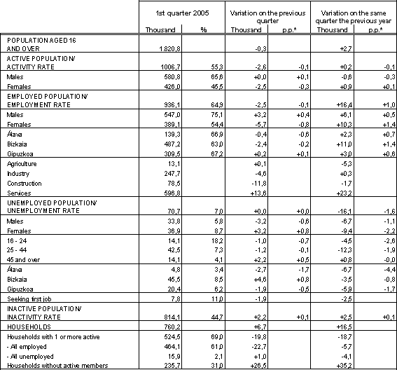 The number of unemployed was estimated at 70,700 in the first quarter, falling in Álava and Gipuzkoa and increasing in Bizkaia. In Álava there were 2,700 fewer unemployed persons than three months before, with the best level of the three provinces (3.4%). In Gipuzkoa there were 20,400 unemployed, 1,900 fewer than three months before, giving a rate of 6.2%. In Bizkaia, with a total of 45,500, there was an increase of 4,600 persons, increasing the rate to 8.5%.