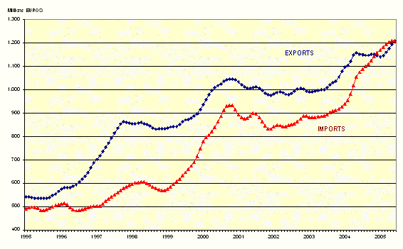 Exports to the European Union-25 registered a 5.1% rise, with those going to Italy growing by 20.4%, to Germany by 7.3%, to the United Kingdom by 3.8%, to Portugal by 5.7% and to Belgium by 30.9%, to mention the most significant countries. There was a decrease, however, for those going to France (-0.2%), the Netherlands (-8.6%), Ireland (-4.2%) and Poland (-3.5%), among others. Imports coming from the European Union grew by 9.0% in the first six months of 2005, when there was an increase for our main customers/suppliers such as France (0.8%), Germany (6.5%), Italy (6.9%) and the United Kingdom (5.5%).