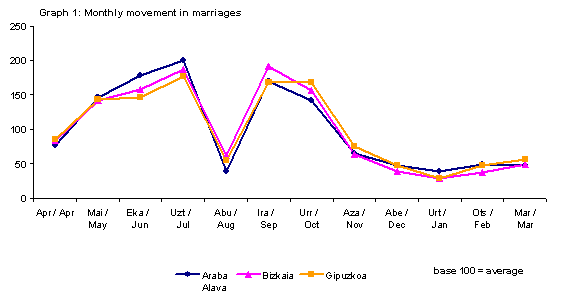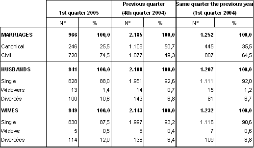 As has been the case in other years, this quarter saw the greatest proportion of civil weddings (74.5%), outnumbering religious ceremonies and surpassing the percentage of civil weddings from the same period of last year by ten points. The percentage of civil weddings increased in all three provinces in relation to the same quarter of 2004, with Alava undergoing the greatest increase (18 percentage points), giving a figure of 85.2%. Bizkaia and Gipuzkoa increased by 11.6 and 5.6 percentage points, 74.2% and 73%, respectively.