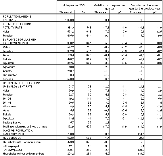The number of people out of work, which stood at 58,700 in the second quarter, fell in Gipuzkoa and Bizkaia and rose slightly in Álava. In Gipuzkoa, there were 13,400 people out of work, 7,000 less than three months previously, giving a rate of 4.1%. In Bizkaia, with a total of 39,800, there was a fall of 5,700 people, reducing the rate to 7.7%. In Álava there were 700 more people out of work than there were three months earlier, but it remained the province with the most positive rate (3.8%) of the three.