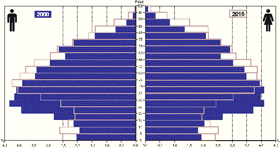 However, this change is not enough to counteract the considerable increase in the population aged 65 or above: 101,000 people more, representing a proportional increase among the total population for this age group, from 17.6% in 2000 to 21.3% in 2015. But the biggest increase occurs in the proportion of people aged 85 or over, increasing from 9.9% of the total population in 2000 to 16.4% in 2015, as a result of the consequence of a higher growth rate of the very elderly segment of the population (+5.14% annual) with respect to the elderly (+1.64% annual). This rate of growth represents an absolute increase of more than 40,000 personas aged 85 or above, from 36,100 to 76,600 in 15 years, more than double, in what is a very short time period.