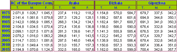 The A.C. of the Basque Country will have 2,194,900 inhabitants by 2015, of which 1,070,600 (48.7%) will be male and the rest, 1,124,300 (51.3%), female. As a consequence there will be almost 116,000 more people than in 2000. It is predicted that in these fifteen years the population of the A.C. of the Basque Country will increase at a consistant but moderate annual growth rate of +0,36%.