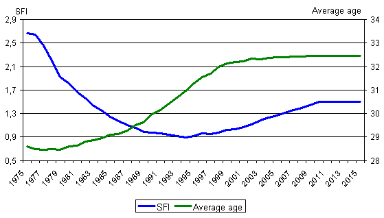Although still far from guaranteeing the generational replacement, the number of births per female reveals a significant recovery, as it represents an increase of 50% on the level reached in 2000, and reaches 1.5 children per female in the year 2015. The improvement in fertility will be witnessed in all age groups, but mainly in women of 30 years of age or more, to which 73% of children will be born in 2015 compared to 64% in 1995, which was one of the lowest years for fertility. A consequence of this is that the average age of maternity will rise from 31.3 to 32.5 in these 20 years.
