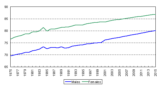 Life expectancy at birth will reach 80.2 for men and 86.9 for women in 2015, figures which were 76.4 and 83.7, respectively, in 2000. However, in these years the gap between male and female mortality rates will diminish, something that had been witnessed in the last five years of the previous century. The difference between life expectancy for women and for men will fall from 7.3 in 2000 to 6.7 in the final period considered in this projection, that is the year 2015.
