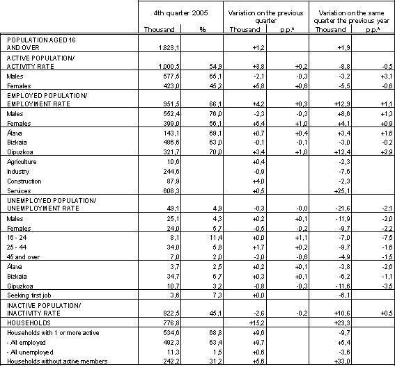 The number of people out of work, which is to say that were looking for work, carrying out active job searches and were also available for work, was estimated at 49,100 in the fourth quarter, 300 less than three months previously. By province, in Gipuzkoa, with a total of 10,700, there was a fall of 800 and the rate diminished to 3.2%. On the other hand in Álava there were 3,700 jobless, 200 more than three months previously, making its rate 2.5% and in Bizkaia it was estimated that there were 300 more people out of work than there had been three months earlier, meaning that it maintained the most negative rate of the three provinces (6.7%).