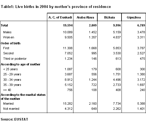 Births to unmarried parents came to 4,312 in 2004, a figure which represented 22% of total births and was higher than in 2003 (19.9%), according to EUSTAT data. Alava and Bizkaia had higher percentages than the whole of the A.C. of the Basque Country, with 23.1% and 22.6%, respectively; Gipuzkoa was the only province with relatively low values (20.6%). Over the last 10 years the proportion of births to unmarried parents has doubled, as in 1995 it was 10%.