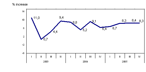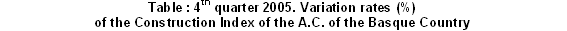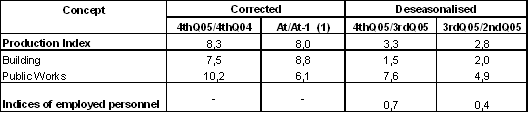 The evolution of the construction sector in the fourth quarter of 2005 was supported more by the subsector Civil Works than by Building, the former increasing by an inter-annual rate of 10.2%, compared with a 7.5% rise obtained by the latter. In accumulated terms of the positions were inverted, with 8.8% growth for Building over the whole of the year and 6.1% for Civil Works.