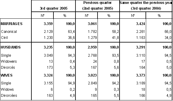 The 3,359 weddings held in the third quarter of 2005 involved 3,235 males and 3,324 females resident in the A.C. of the Basque Country. For 3,049 grooms (94.3%) this was their first wedding, while 13 widowers and 173 divorcees remarried. The percentage of first marriages for females was similar to that of males: there were 3,155 (94.9%) single brides, 6 widows and 163 divorcées.