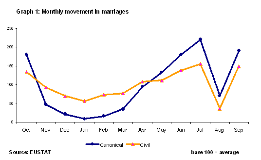 There was a significant increase in the number of church weddings held in this quarter. Compared with the winter months, when over half the weddings were civil, in this period 63.4% of ceremonies were religious, although they decreased by 3% with regard to the same period the year before. In Gipuzkoa religious weddings represented 61% of the total, 63% in Bizkaia and in Alava the figure reached 65%.