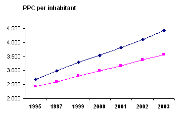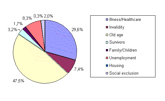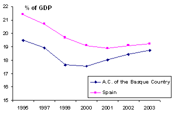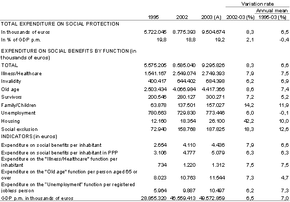 Expenditure carried out in the old age function, which, apart from pensions, includes other benefits such as home care or accommodation for the elderly, came to 4,265 million euros. For people aged 65 or over, it came to 11,145 euros. After eliminating the effect of prices, the purchasing value of old-age benefits per person in this age group grew at a rhythm of 1.1% per year between 1995 and 2003.