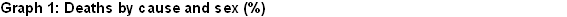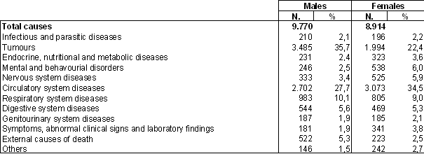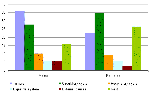 The cause of death was different according to sex, as tumours were more prevalent among males than circulatory system diseases, while among females the main cause was cardiovascular diseases and tumours in second place.