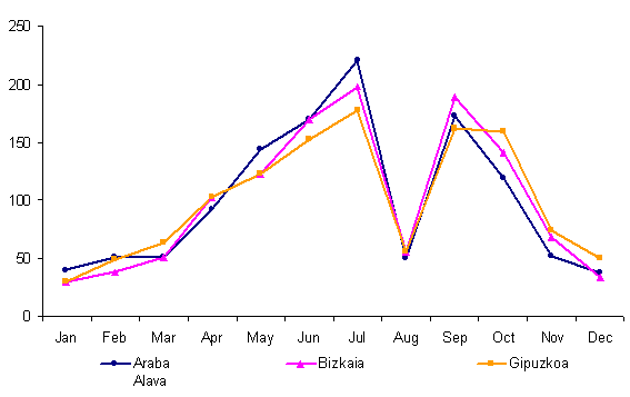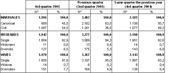In the 1,996 weddings in the fourth quarter of 2005, 1,942 male and 1,970 female residents of the A.C. of the Basque Country got married. For 1,804 men (92.9%) this was their first marriage, while 11 widowers and 127 divorcés remarried. The percentage of first weddings for women was slightly lower than for men: 1.805 (91.6%) single women married, 14 widows and 151 divorcées.