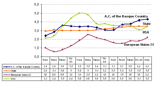 The GDP of the A.C. of the Basque Country underwent an increase of 4.3% in the first quarter of 2006 with regard to the same period a year before, according to EUSTAT data. This inter-annual growth rate was point eight percent higher than that obtained by the state economy (3.5%) and practically doubled that reached by the EU-25 (2.2%) and the euro zone (2.0%).