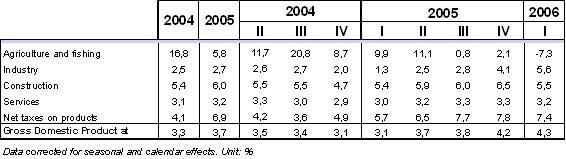 The Construction sector, in line with the performance of previous quarters, continued to be an important contributor in this first quarter of the year with 5.5% inter-annual growth on the first quarter of 2005. The inter-annual rate fell one point in relation to the previous quarter, but the inter-annual evolution of 1.0% indicates and corroborates, for the moment, its strength.