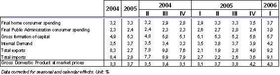 As occurred over the previous quarters, the most active element in internal demand is once again the Gross formation of capital. Investment registered 5.7% real inter-annual growth, point one higher than the inter-annual rate for the previous quarter (5.6%) and showing a positive inter-quarterly rate of 1.3%, although lower than the 1.8% for the fourth quarter of 2005. Investment in building and public works, as well as investment in industrial capital goods, continues to mark a sustainable and slightly upward trend.