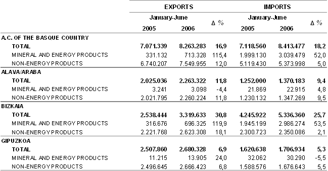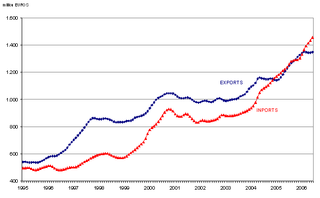 Exports destined to the European Union-25 rose by 11.2%, with a 6.4% increase in exports to France (first client in volume), 13.1% to Germany, 24.8% to Italy and 2.4% to the UK, to quote the four main clients for our exports in the European Union. In addition, exports destined to the USA registered a sharp increase of 96.9% over the first six months. Imports from the European Union increased in value by 8.4%, 6.7% from Germany, 6.5% from France, 3.8% from Italy and a 3.2% decrease in imports from the UK. Of the rest of the economic areas the main suppliers were the Commonwealth of Independent States (CIS) with 1,264.1 million, followed by the Organization of Petroleum Exporting Countries (OPEC) with 1,068 million euros.