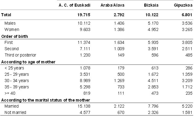 In 2005 the number of births in the A.C. of the Basque Country reached a figure of 19,715, which represented a 0.6% increase with regard to 2004; this growth was lower than experienced between 2003 and 2004, and came to 1.7%. In Bizkaia, in 2005, there was a higher increase (1.3%), followed by Gipuzkoa (0.2%), while Álava registered a 0.6% decrease.