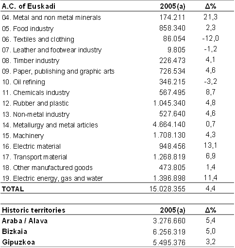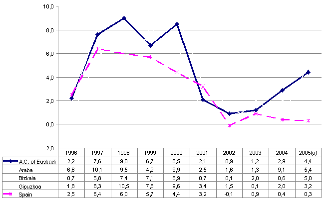 The highest growth by province corresponded to Álava, whose rate in 2005 came to 5.4%, a point more than the average. Annual growth in Bizkaia (5.0%) was also half a point higher than the average for the Community and industry in Gipuzkoa was below the average by one point two (3.2%).