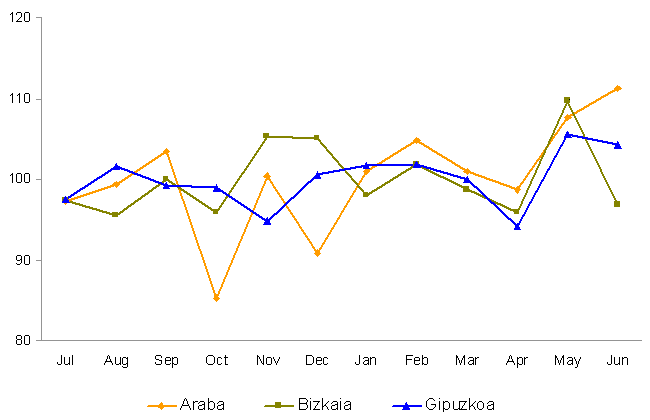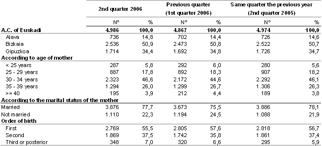 Data for the second quarter of 2006 on Birth Statistics, carried out by EUSTAT, give a figure of 4,986 births in the A.C. of the Basque Country, practically the same as in the same period the year before. By provinces, 736 babies were born in Álava, 2,536 in Bizkaia and 1,714 in Gipuzkoa