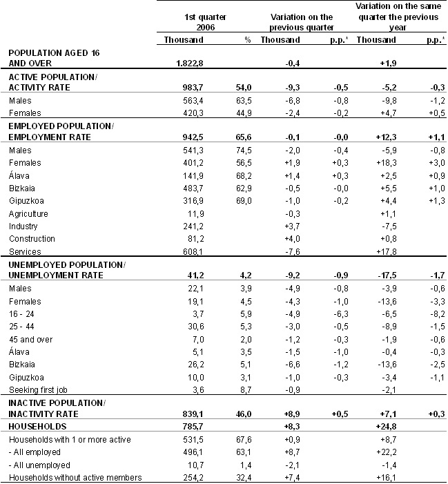The number of unemployed, i.e. persons who are seeking employment, take active measures to find work and in addition are available to work, is estimated to be 41,200 in the second quarter, 9,200 persons fewer than three months before. By provinces, in Álava, with a total of 5,100, there was a decrease of 1,500 persons, the rate falling to 3.5%, in Bizkaia there were 26,200 unemployed, 6,600 fewer than three months ago, but with a less favourable rate (5.1%) and, in Gipuzkoa it was estimated 1,000 persons fewer unemployed than three months before and with the most favourable rate in the three provinces (3.1%).