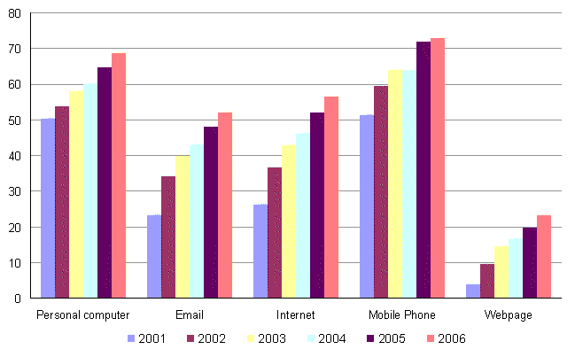 In comparison, the average for establishments with more than 10 employees ranged from 66.4% who had a website to 97.6% who possessed a computer and also included 86.4% with mobile telephones, 92.8% with e-mail and 93.0% with Internet access.