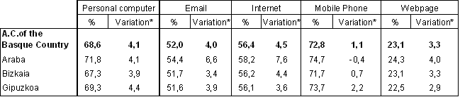 Although the differences between the Provinces were not very significant, the establishments of Álava, which obtained the highest percentage increases, were the best equipped as regards these technologies, followed by Bizkaia in Internet, e-mail and websites and Gipuzkoa in computers and mobile telephones.