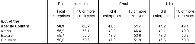 There was also a significant rise regarding the number of employees using these technologies. 59% of personnel used a computer and 47.1% and 47.4%, respectively, had access to the Internet and e-mail. In this case, unlike the previous comparison between establishments by province, the highest percentage of employees using these technologies was in Bizkaia, followed by Gipuzkoa and Álava.