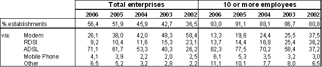 Table 3: Establishments with Internet access and the form of connection (%).
