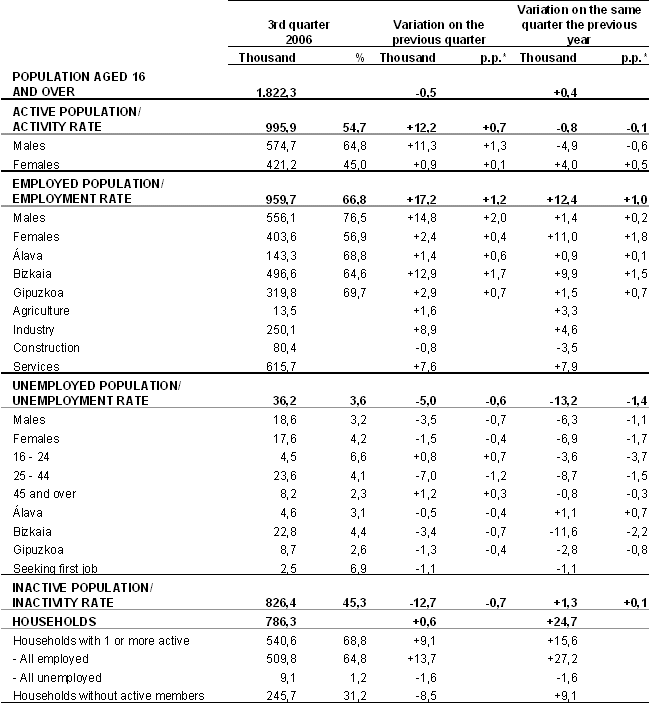 The number of unemployed, i.e. persons who are seeking employment, take active measures to find work and in addition are available to work, is estimated to be 36,200 in the third quarter, 5,000 persons fewer than three months before. By provinces, in Álava, with a total of 4,600, there was a decrease of 500 persons, the rate falling to 3.1%, in Bizkaia there were 22,800 unemployed, 3,400 fewer than three months before, but with a less favourable rate (4.4%) and, in Gipuzkoa it was estimated 1,300 persons fewer unemployed than three months before and with the most favourable rate of the three provinces (2.6%).