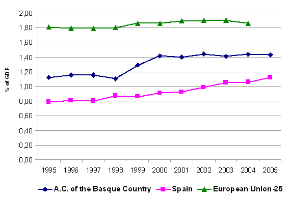 There is a proven positive relationship between the level of GDP per inhabitant and the percentage of GDP allocated to R&D. The wealthiest countries were those that made the greatest investment in R&D, which is to say more than 2.5% of their GDP: Sweden, Finland, Japan, Iceland, Switzerland, the USA and Germany. Among those who made an intermediate investment, from 1.5% to 2.5% of their GDP, were Denmark, Austria, France, Belgium, the United Kingdom, Holland, Luxembourg and Norway. The smallest investment in R&D was in Ireland (1.20%), Italy (1.11%), Spain (1.12%), Hungary (0.89%), Portugal (0.74%) and Poland (0.56%).