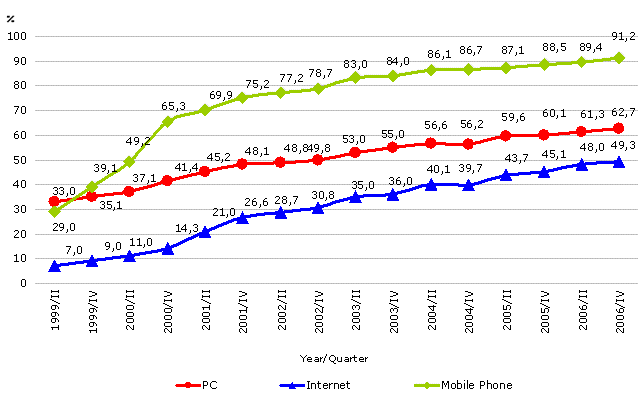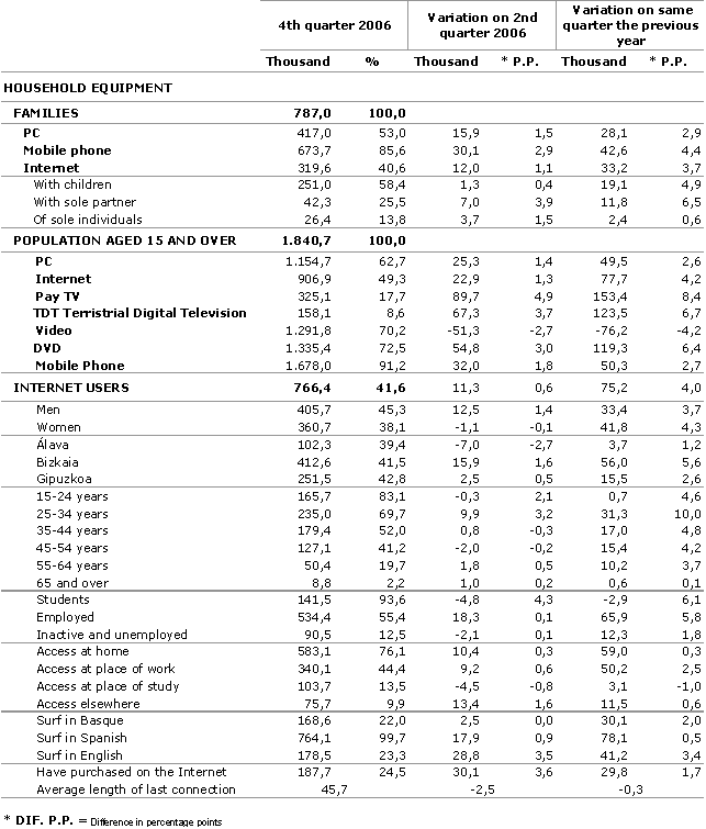 With regard to activity, there was a 3.5% rise in the number of Internet users among workers, with regard to the same quarter in 2006. In the case of students, the percentage fell by 3.3% and in that of inactive or unemployed persons it fell by 2.3%. In addition, there was an 2.8% increase in connections at the workplace. At places of study, however, Internet access fell by 4.2%. At home there was a slight increase –1.8%, other places of access –Cybercafés, hotels, leisure areas,…– offering a greater increase, which came to 21.5%.