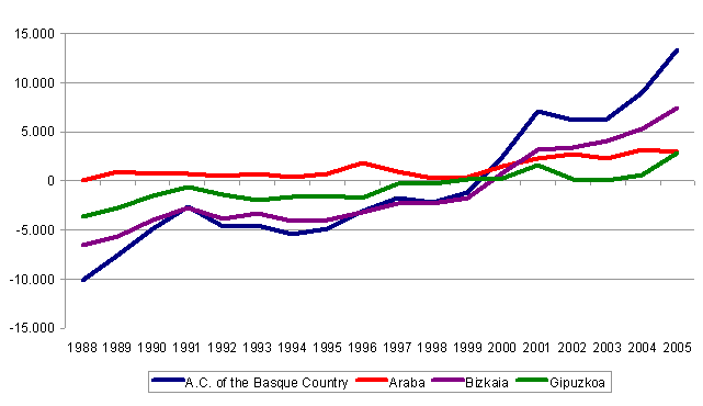 If we take into account only movement between the A.C. of the Basque Country and other autonomous communities, 740 persons more than the previous year arrived in 2005, which represents an increase of 4.4%. Therefore, the migratory balance between the A.C. of the Basque Country and other autonomous communities continues to be negative, with a loss of 1,497 persons. On the other hand, the migratory balance for persons from foreign countries is positive, with 14,818 persons more, a figure which represents a 27% increase with regard to the previous year.