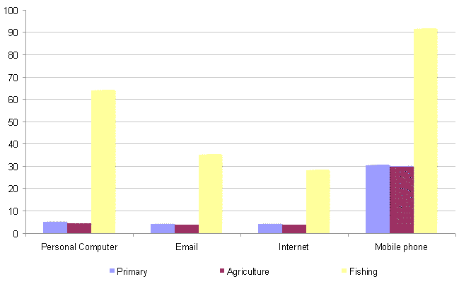 Thus, while in the agricultural sector the availability of Technology reaches very low percentages, which vary from 29.6% for mobile phones to 3.6% for email, with 4.3% in computers and 3.8% in Internet, among fishing companies these percentages rise to 91.3% for the mobile phone, 35.2% for email, 64.0% for computers and 28.2% for the Internet.