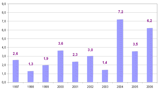 Among the prices of the most relevant raw materials consumed by the sector that have risen most in price over 2006 are: Electric energy (24.8%), Iron and steel (22.0%), Metal piping (17.3%) and Glass (12.8%). By contrast, there were reductions in annual prices (December 2006 on December 2005) of the raw materials for Oil by-products (-4.8%), Asphalt products (-2.8%) and Ceramic products (-0.1%).