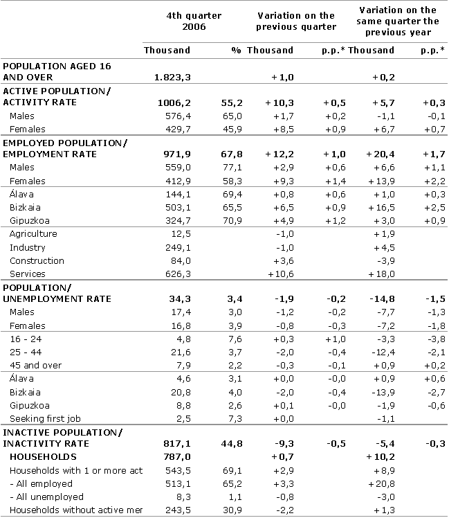 The number of jobless, which is to people seeking employment, actively making job searches and also available for work, was estimated at 34,300 for the fourth quarter, 1,900 less than three months earlier, By province, the number of jobless in Álava, totalling 4,600, remained stable and put the unemployment rate at 3.1%; in Bizkaia, there were 20,800 people out of work, 2,000 less than three months earlier, although it still had the highest rate (4%), whereas in Gipuzkoa, despite there being 100 more people out of work than three months earlier, the unemployment rate was the lowest of the three provinces (2.6%).
