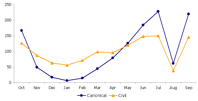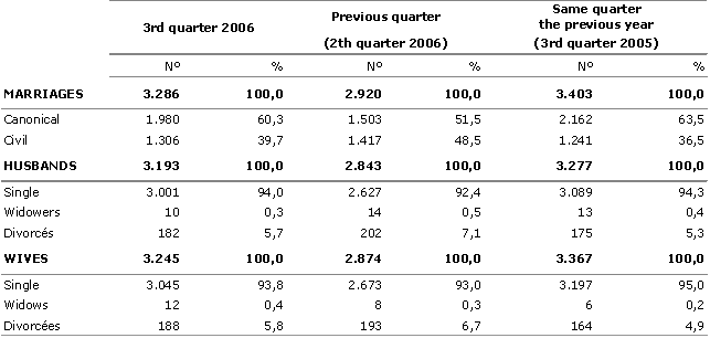 In July, August and September 2006 there were a total of 3,286 weddings in the A.C. of the Basque Country, meaning a 3.4% decrease in relation to the same quarter of the previous year, according to Eustat data. Residents of Bizkaia celebrated 1,675 weddings, a 5.2% decrease; those from Álava, with 421 weddings, registered 4.1% fewer and only residents of Gipuzkoa, with 1,085, registered an increase of 2.7% with regard to the same period of the previous year. In the case of residents from outside the A.C. of the Basque Country, the number of weddings came to 105.