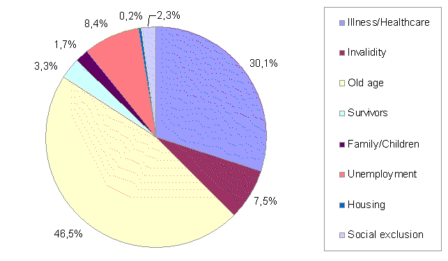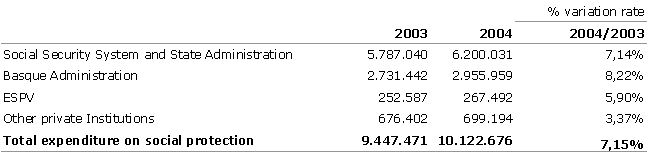 Expenditure on the function Ageing, which in addition to pensions includes other benefits such as home care or accommodation for the aged, came to 4,605 million euros in 2004, representing 46.5% of total social benefits. The amount per person aged 65 or over came to 11,949 euros in 2004, which represents a 6.3% variation with regard to 2003.
