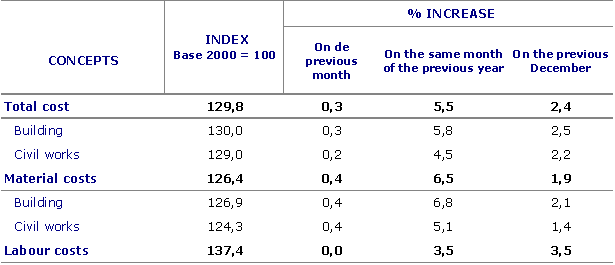 In the month of February the highest increases in prices were observed in petroleum derivates (4.1%), elaborated stone (4.1%), asphalt products (3.5%), glass (2.9%) and lime, gypsum and plaster (2.2%), among others. On the other hand, there has been a decrease in prices of raw materials in the following chapters: used machinery accessories (-2.4%), explosives and gases (-1.6%), metal piping (-0.8%) and electrical devices and material (-0.2%), among others.