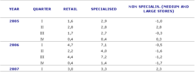 Specialised retail trade saw the highest inter-annual growth rate in the Food Sector, which registered 6.4% nominal growth, which in real terms was a rate of 2.7%. Sales of Household Equipment also grew significantly, by 5.3% in nominal terms, which in real terms was also a positive rate of 4.0%. Sales of Personal Equipment grew by 3.9% in constant euros, which was a growth of 2.9% in real terms. On the other hand, Other Consumer Products (sports, toys, opticians and bookshops, etc.) registered nominal growth of 3.2%, but, due to the deflationary effect of its prices, this rate becomes 3.5% in real terms.
