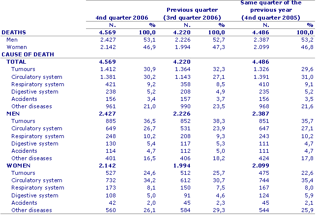 The provisional total number of deaths for 2006 came to 17,897, of which 9,444 were men and 8,453 women. Compared to the provisional data for the previous year, 924 less deaths were registered, meaning a decrease of 4.9%.