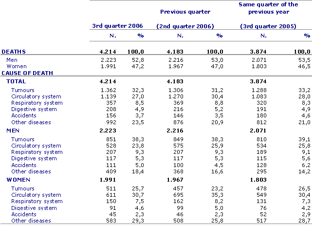 The main cause of death was tumours, which accounted for the deaths of 1,362 people (32.3%); following this, as the second cause of death, were diseases of the circulatory system, giving rise to 1,139 deaths (27%). In third place came respiratory diseases, which caused 357 deaths during these months (8.5%).