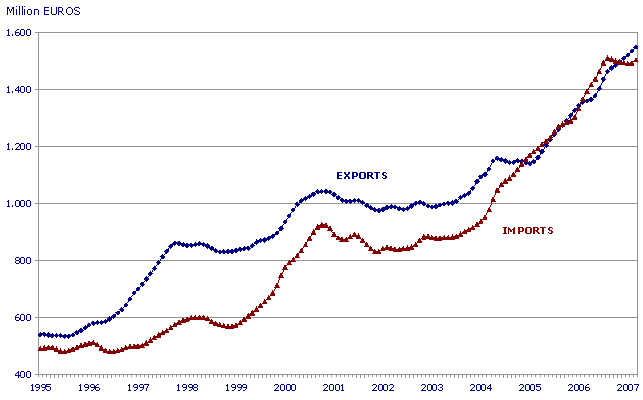 The foreign trade balance showed a surplus once more in the first quarter of 2007, as was the case in the same period of 2006, with its value rising to 265.8 million, greater than the figure of 75.2 million from 2006. As a result, the coverage rate of exports over imports stood at 106.2%, when a year earlier it was 101.8% and in the first quarter of 2005 it was 94.0%.
