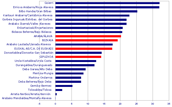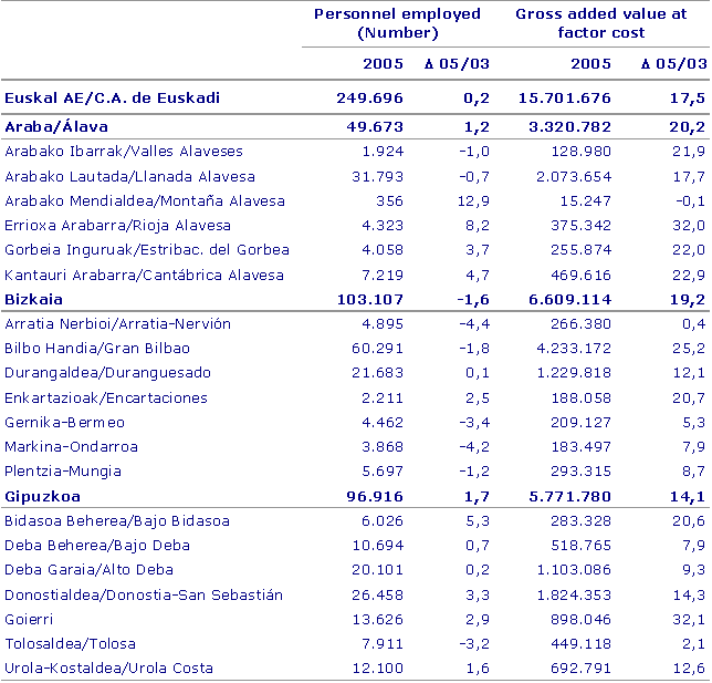 Three regions, which include the three territorial capitals and their catchment areas, accounted for slightly over half (81.9%) of the industrial wealth created in the A.C. of the Basque country, according to Eustat data. Twenty-seven per cent of the industrial added value was generated in the Gran Bilbao region, followed by the Llanada Alavesa (Vitoria-Gasteiz) with 13.2% and Donstialdea, with 11.6%. Overall, the industrial employment rate stood at 118,542 people, i.e., 47.5% of the workforce employed in the industrial sector of the three historical provinces.