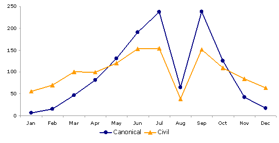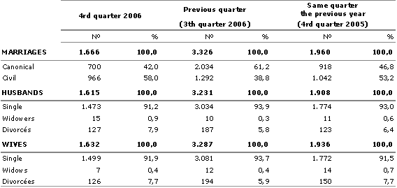 There was a total of 1,666 marriages in October, November and December in the A.C. of the Basque Country, meaning a 15% decrease in relation to the same quarter of 2005. By province, residents of Bizkaia held 845 weddings, followed by those of Gipuzkoa, with 608 and those of Álava, with 161. In the case of those who had settled outside of our Community, the number of weddings came to 52.