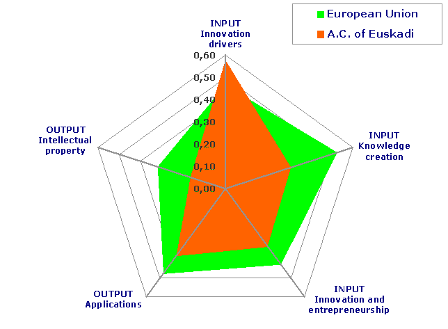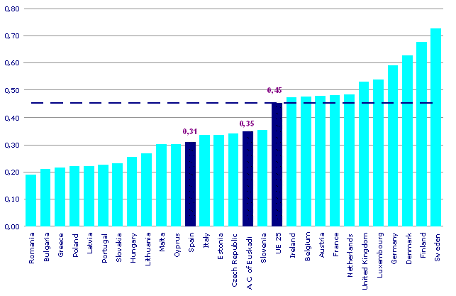 The A.C. of the Basque Country, out of the 27 countries of the European Union, occupies the 13th position, exactly mid-table, on the European Innovation Scoreboard with a score of 0.35 (out of a maximum of 1.00), according to Eustat data, with the European Union average for 2006 estimated at 0.45. Within the group of the Innovation leader countries are Sweden -0.73-, Finland -0.68-, Denmark -0.63- and Germany -0.59-. If belonging to the European Union is not taken into account, they would also be joined by Switzerland -0.69- and Japan -0.61-.