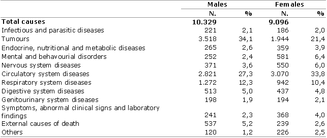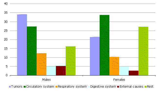The cause of death differed according to sex, since among men tumours outnumbered circulatory system diseases, whereas among women the main cause was cardiovascular diseases and secondly tumours.