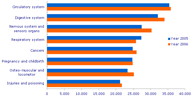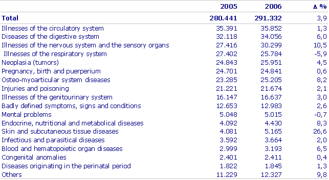 Circulatory system diseases, with 12.3% of the total number of discharges in 2006, continued to be the main cause of hospitalisation, unlike the State as a whole, where it occupied second position, following pregnancy, childbirth and puerperium (2005). Within this group, varicose veins, cardiac insufficiency, coronary arteriosclerosis, and arrhythmias were the pathologies causing the greatest number of hospitalisations.