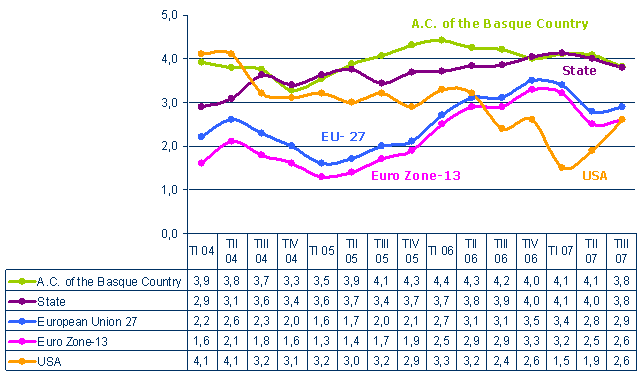 The number of Employed Personnel in the A.C. of the Basque Country showed an inter-annual increase of 2.3% in the third quarter of 2007, and ended with a consolidated number of one million jobs, specifically 1,016,388, generated by the Basque economy. All the activity sectors have positively contributed to the net generation of jobs, except for the primary sector.