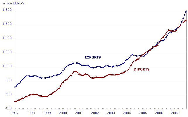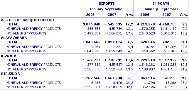 The largest duty tariff sections, in the A.C. of the Basque Country were the ones that contributed the most to the positive evolution of quarterly exports: Metal and Manufactured increased sales abroad by 39.0%, Electrical Material by 13.3%, Transport Material by 6.4%, Mineral Products 13.1%, and Plastic and Rubber by 7.5%, to name the most important ones. In the area of imports, Metal and Manufactured increased by 17.7%, Electrical Material by 14.8%, Transport Material by 20.7%, Plastic and Rubber by 13.9%, although Mineral Products fell by 9.9%, a decrease which conditioned the evolution of imports.